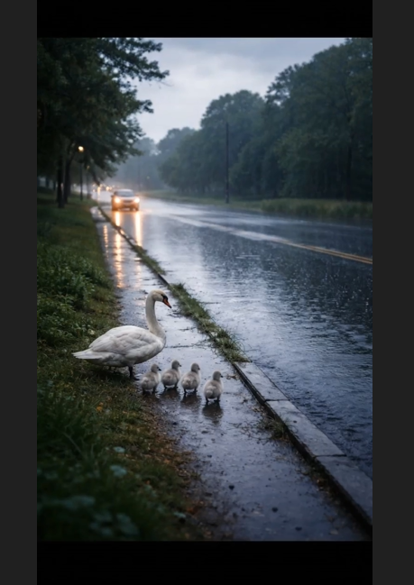 A quiet suburban road curved gently beside a small lake. The air was calm, and a light rain began to fall — the kind that feels harmless at first. Along the grassy edge of the road, a mother swan walked carefully with her tiny cygnets following in a neat, fragile line.